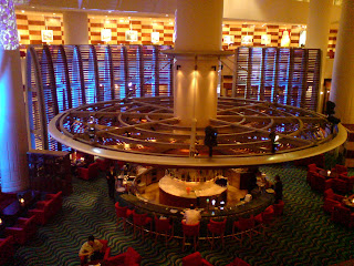 Functions are mixed on this island. In the theater, the backdrop of the stage is the playground; as you sit in the bleachers and focus on the stage, there’s a playground of screaming children in the background. In the café, the playground forms a wall and ceiling; a child climbs above you as you take another drink.